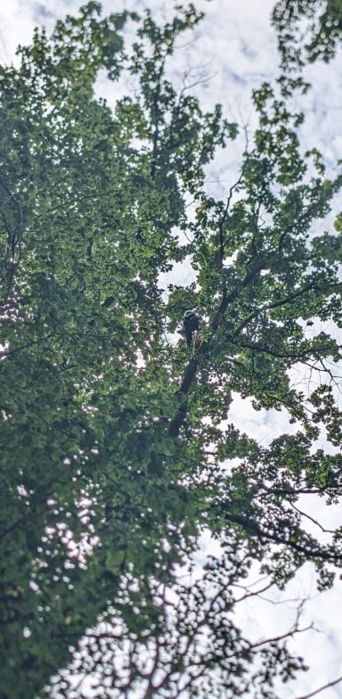 Mit Spezialausrüstung gelangen wir ergonomisch und kräfteschonend in große Baumkronen. Dank dieser Technik erreichen wir selbst die höchsten Wipfel sicher.