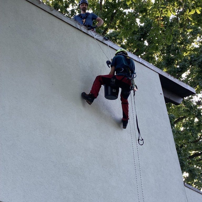 Wir nutzen die sichere Industrieklettertechnik. Das spart Ihnen Zeit und hohe Mietkosten für ein störendes Gerüst.